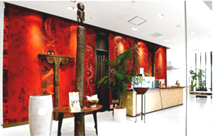 The artist selected the overarching theme to be 'Asian Red' (right: entrance lobby). The large scale mural measuring 12ft x 24ft (360cm x 720m) used 100% organic materials; painted on multiple sheets of handmade paper with Japanese pigments, persimmon tannin, charcoal ink, which as then mounted directly onto the wall with rice glue. It would act as a bold statement making the store very visible but more importantly, it needed to be Exotic, so that the visitor may return to their oceanic 'retreat', which felt as far away from their daily life as possible.