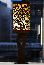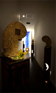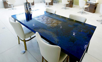 Other mediums used were iron, wood, hemp, glass and stone; and expressed in a Japanese way where art and design whether new or old are not treated as separate but rather as one. In order to balance the artificial design of the existing space and furniture, great energy was given to detail in making each piece unique. Each piece was given a function, for example, the custom designed iron lamp placed along the window (right) would make the salon visible from the passing train across the street. Each piece would also serve to make the art as interactive as possible (bottom: discussion table mounted with blue painting & antique Balinese woodblock).